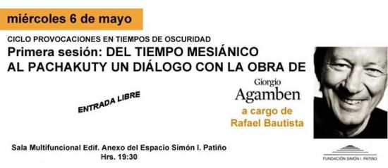 El ciclo de conferencias Provocaciones en tiempos de oscuridad presenta su primera sesión con el escritor y filósofo boliviano Rafael Bautista S. quien hablara Del tiempo mesiánico al pachakuty un diálogo con la obra de Giorgio Agamben.