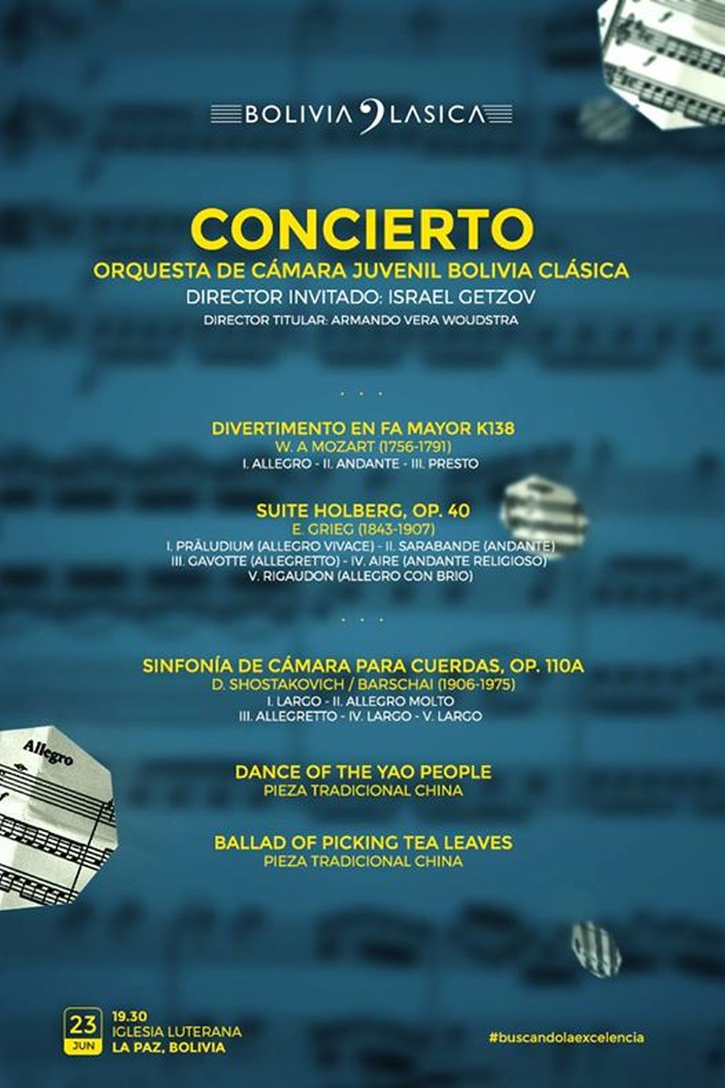 El concierto será interpretado por la Orquesta de Cámara Juvenil Bolivia Clásica bajo la dirección del estadounidense Israel Getzov.