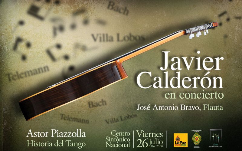 El Centro Sinfónico Nacional presentará este viernes 27 de Julio un concierto de guitarra clásica interpretado por Javier Calderón en la guitarra junto a José Antonio Bravo, flauta.