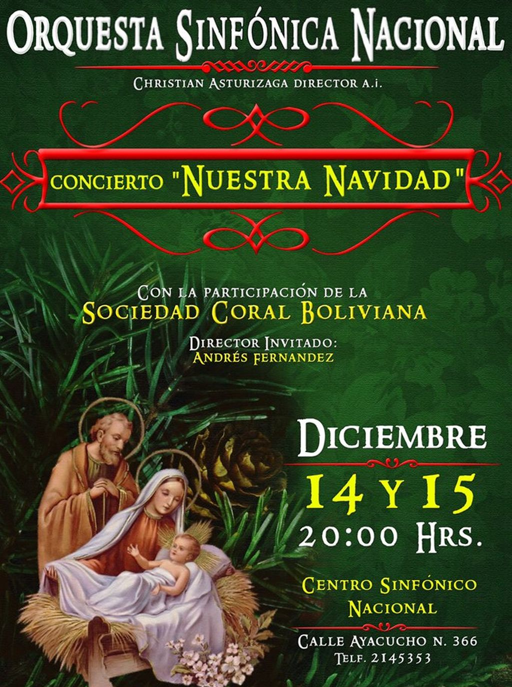 Nuestra Navidad será un concierto de tradición universal, bajo la dirección de Andrés Fernandez, empezará con la magna obra musical argentina de Ariel Ramírez “Misa Criolla” de la que se ejecutarán Kyrie (Vidala –baguala), Credo (Chacarera trunca), y Gloria (Carnavalito-yaraví).