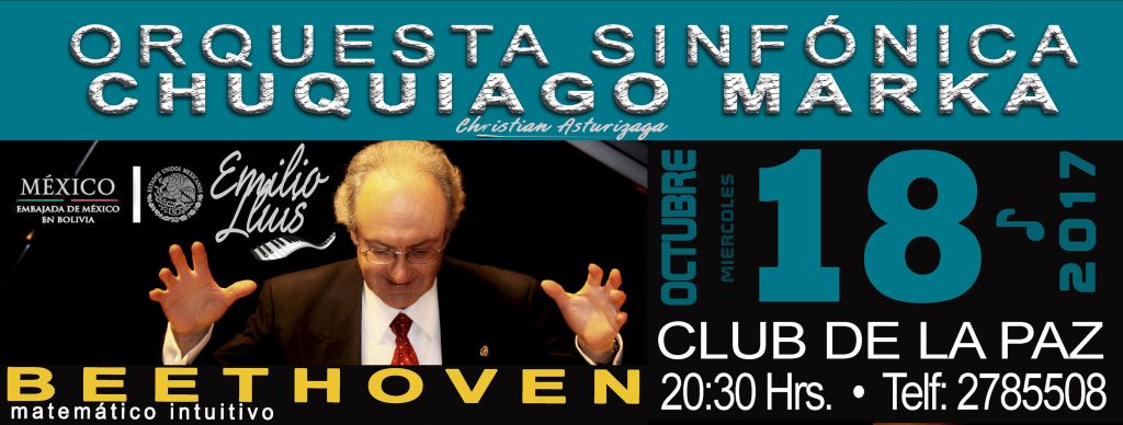 La Orquesta Sinfónica Chuquiago Marka realizará un concierto bajo la dirección del Maestro Christian Asturizaga y con la participación del reconocido pianista mexicano Emilio Lluis junto a la voz de Diana Azero. También se contará con la participación del solista internacional Emilio Lluis llega auspiciado por la Embajada de México en Bolivia y en el marco del XX Congreso Boliviano de Matemáticas donde dará conferencias sobre la relación de la música y la matemáticas.