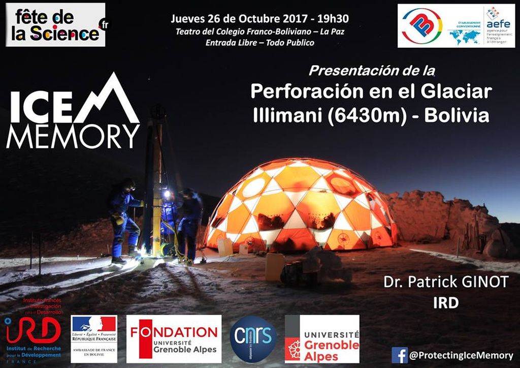 Organizada por el Instituto de Investigación y de Desarrollo (IRD), la Embajada de Francia en Bolivia y el Colegio Franco-Boliviano Alcides d’Orbigny, en el marco de la Universidad de Todos los Saberes anuncian, Ice Memory es el título de la conferencia que dictará Patrick Guinot, científico en glaciología del IRD.