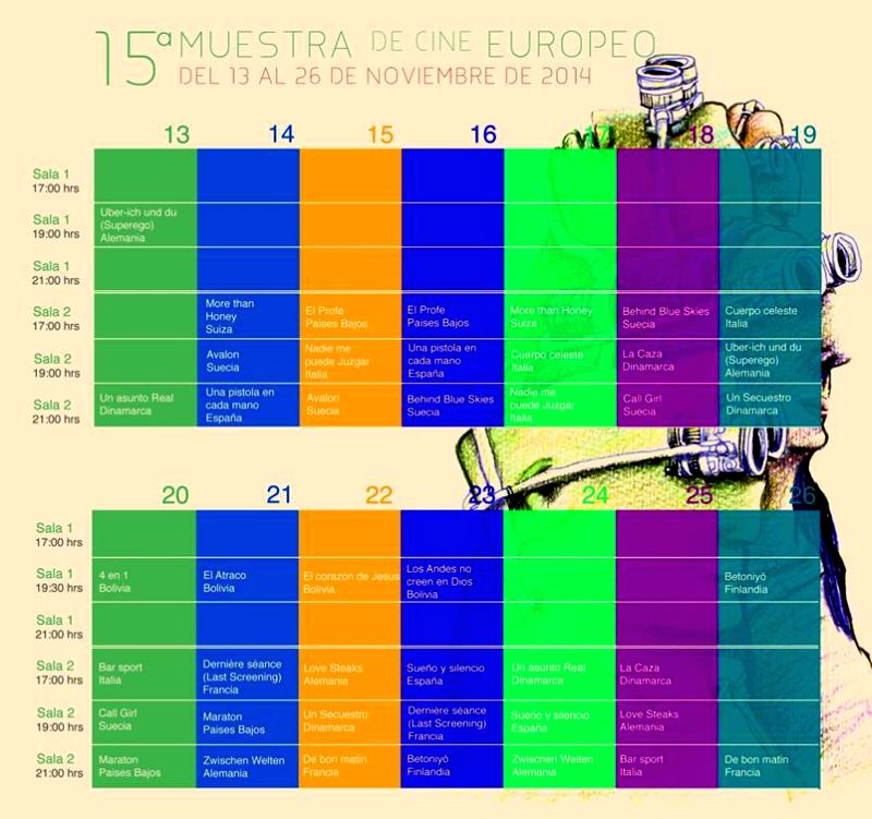 Desde el jueves 13 al miércoles 26 de novimbre se podrán apreciar películas de Alemania, Suiza, Suecia, España, Paises Bajos, Dinamarca e Italia, a continuación tienes el programa: