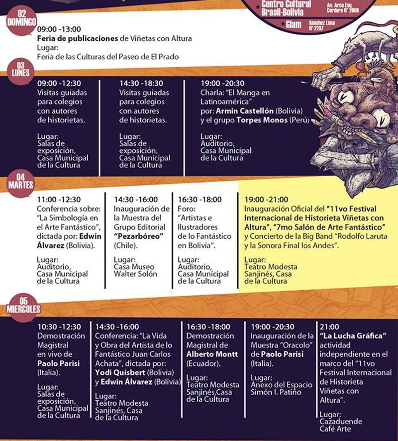 La onceava versión del festival de historietas es organizada por la Asociación Viñetas con Altura, se realizará desde el domingo 2 al 9 de Junio en distintos lugares y escenarios entre los que están: