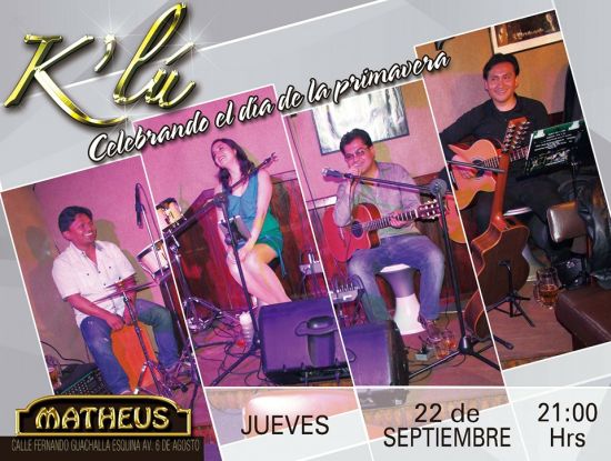 El romántico grupo K’lu se presentará en el escenario del Matheus Pub, compartiendo un repertorio especial para quienes deseen festejar el Día de la Primavera.