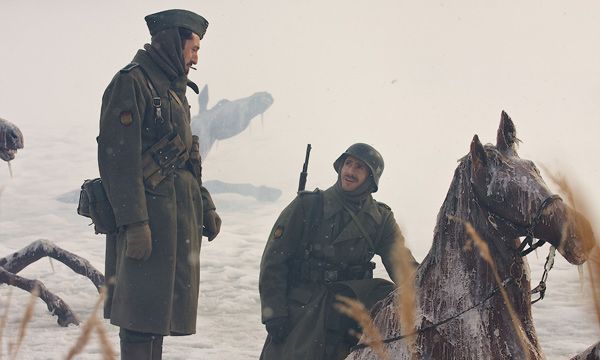 Sinopsis: La película nos traslada al invierdo de 1943 en Rusia. El batallón de la División Azul encuentra caballos en el lago congelado, tienen las cabezas esparcidas sobre la superficie y los cuerpos están sumergidos bajo el hielo. Montado sobre uno de los caballos, el cadáver de un soldado español. Un tajo le atraviesa el cuello de lado a lado, y en el hombro tiene una inscripción grabada a cuchillo que dice “mira que te mira Dios”. Los mandos encargan la investigación al soldado Arturo Andrade, ex inspector de la policía, que asume la tarea con rigor y profesionalidad. Arturo cree que el asesinato está relacionado con la masonería. Hay también una segunda hipótesis: que la víctima fuera un agente prosoviético infiltrado en la División.