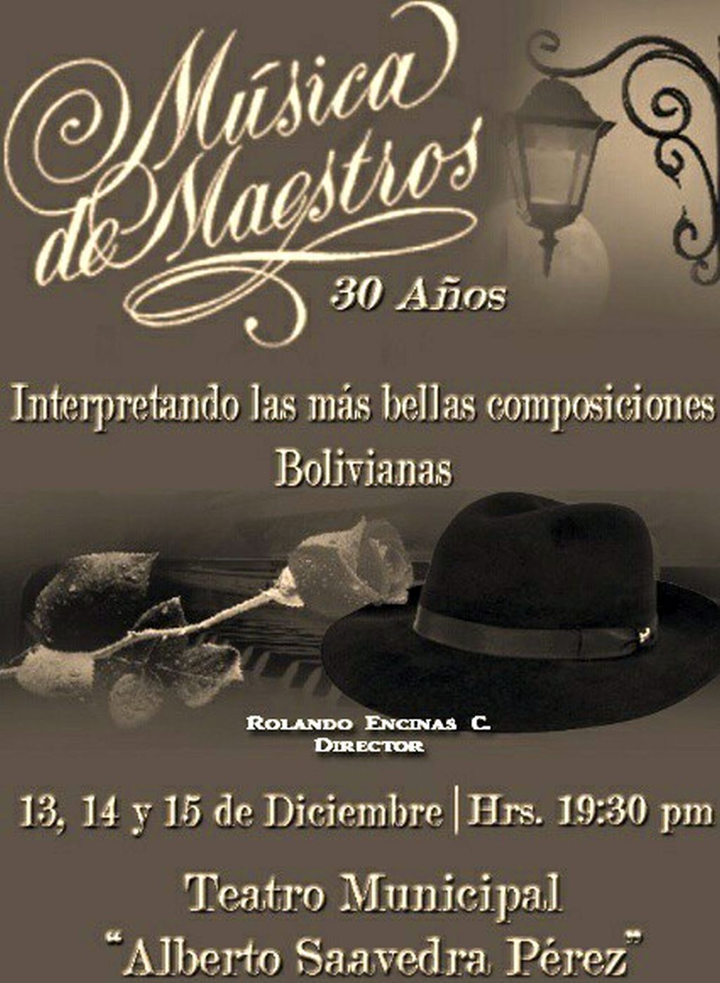 Celebrando 30 años desde su fundación, el concierto Música de Maestros 30 Años se presentará en tres noches consecutivas en las que la Orquesta compartirá con su público una selección de lo mejor de su amplio repertorio de estos 30 años haciendo historia é interpretando las más bellas composiciones bolivianas.