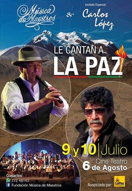 Música de Maestros junto al cantautor y trovador Carlos Lopez le cantarán a La Paz y en esta ocasión, Música de Maestros rendirá homenaje a los compositores paceños, interpretando canciones como Kollita (Fernando Román Saavedra), Rosa Carmín (cueca de Néstor Olmos y Juan Manuel Torres), Chayñita (Adrián Patiño), La Vencedora (Francisco Molina), Marujita (Manuel Elías Coronel), Achacacheñita y Fiesta del Sol (Remberto Carbajal), entre otras.