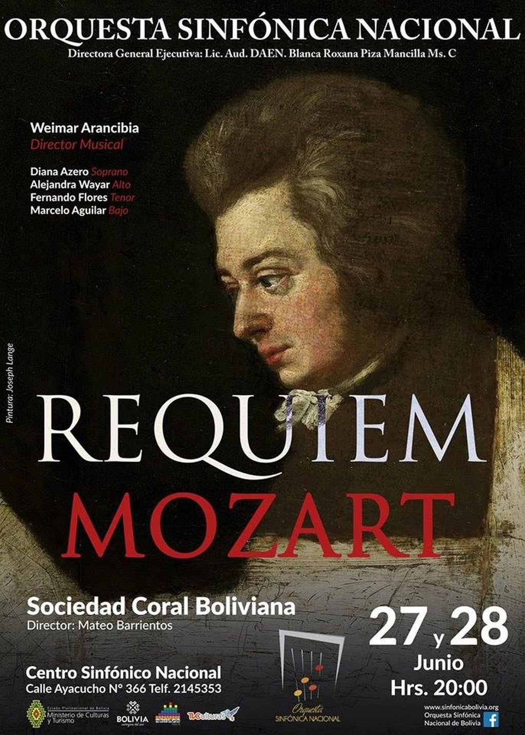 El Réquiem de Wolfgang Amadeus Mozart será interpretado por la Orquesta Sinfónica Nacional dirigida por el maestro Weimar Arancibia junto a la soprano, Diana Azero, Alejandra Wayar, Fernando Flores, Marcelo Aguilar de la Sociedad Coral Boliviana bajo la dirección del maestro Mateo Barrientos.