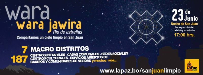 Para este San Juan 2013 en nuestra ciudad, la Alcaldía ha preparado un plan llamado Wara Wara Jawira que en aymara significa Rio de Estrellas. Con este plan se quiere recuperar tradiciones y antiguas costumbres a las que no se les ha prestado mucha atención, como mirar las estrellas por la noche, por ejemplo, aprovechando que la ciudad nos ofrece un cielo limpio en el que se pueden observar las estrellas. También se buscará recuperar la esencia de San Juan como una Fiesta de los barrios y vecinos del Municipio a partir de la constitución de distintos espacios interactivos en los que los vecinos podrán interrelacionarse, compartir y conocer más sobre su barrio Esta inciativa se ha comenzado el 2012 y tuvo gran aceptación de la población, así que este año cobrará más fuerza ya que hasta ahora son 164 intervenciones de las cuales 157 son actividades barriales y 7 centrales, se realizará en cada macro distrito.
