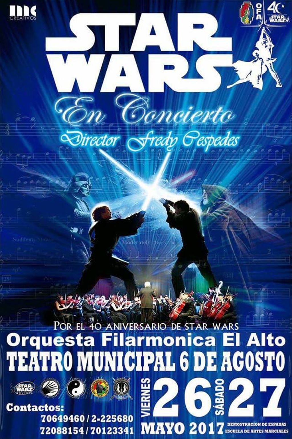 Como parte de las actividades programadas por los 40 años de Star Wars, se presentarán tres conciertos interpretados por la Orquesta Filarmónica de El Alto bajo la dirección del maestro Fredy Céspedes. El repertorio contempla una especial selección de la música de las películas de Star Wars.