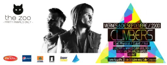 Climbers, son considerados el dúo revelación por sus exitosas producciones en importantes sellos como Get Physical, Culprit, Noir, Electronique Digital. La presentación de esta noche forma parte de una gira mundial en la que visitaron Moscú, Londres, Ibiza, Barcelona, París, Londres, El Cairo, Turín, Lima, Mexicali, Cuenca y Guayaquil.